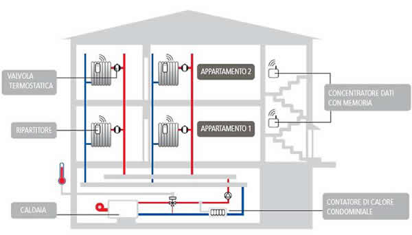 • Su ogni calorifero vengono installate una speciale "valvola termostatica" e un "ripartitore elettronico" (*). Gli inquilini regolano la temperatura ambientale in ogni stanza, utilizzando le manopole poste sui caloriferi, mentre i ripartitori elettronici misurano il calore complessivamente ceduto all'ambiente, memorizzano i dati di consumo, e li trasmettono via radio a degli appositi ricevitori installati nel vano scala (**).